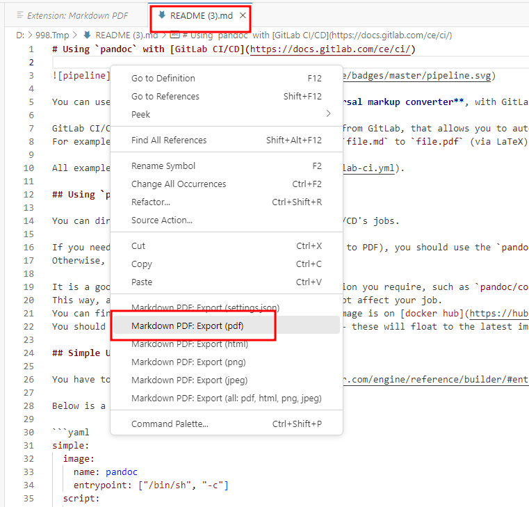 변환하고자 하는 md(README.md) 문서를 열어 문서 우클릭후 Markdown PDF: Export(pdf) 를 클릭 합니다.