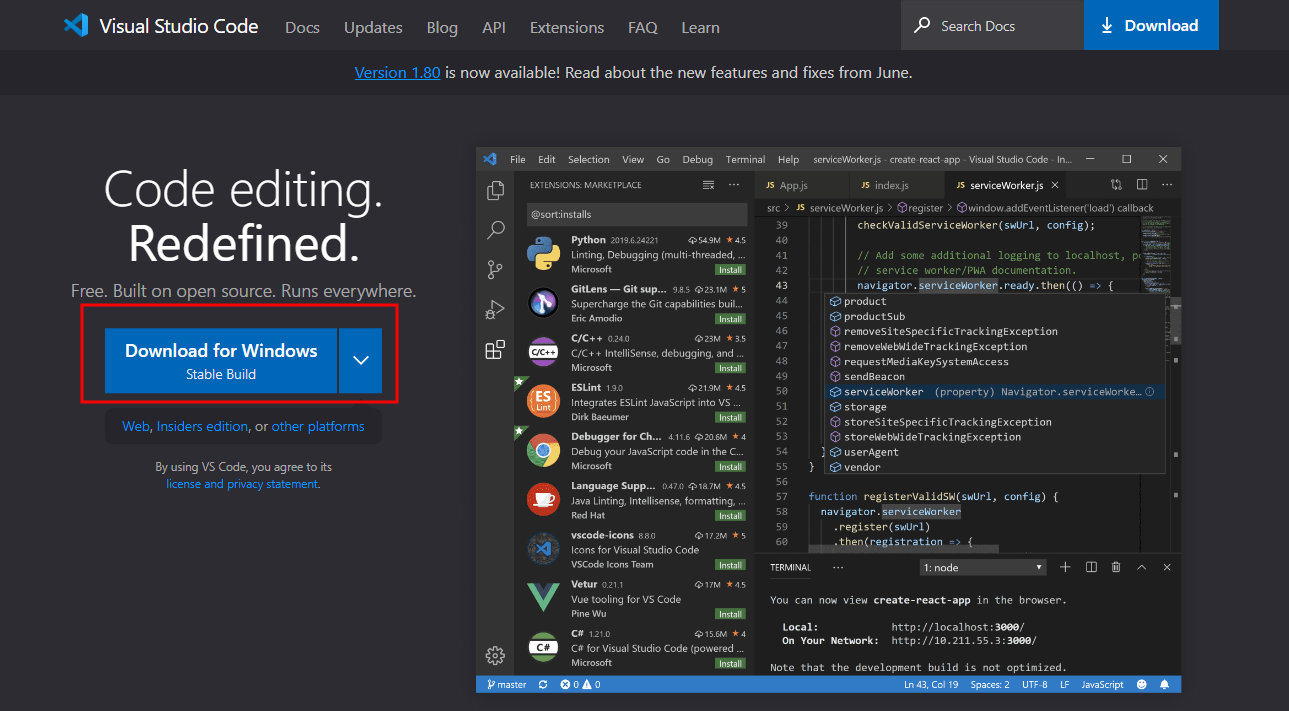 https://code.visualstudio.com/ 경로에 접속여 Visual Studio Code 를 다운로드 받습니다.