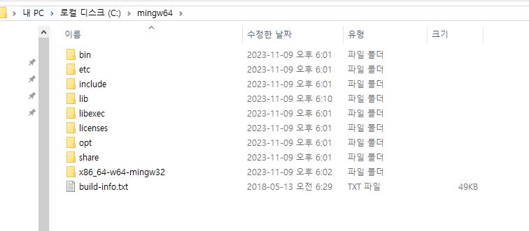 - mingw64 -> x86_64-8.1.0-release-win32-seh-rt_v6-rev0.7z 바이너리 압축 해제