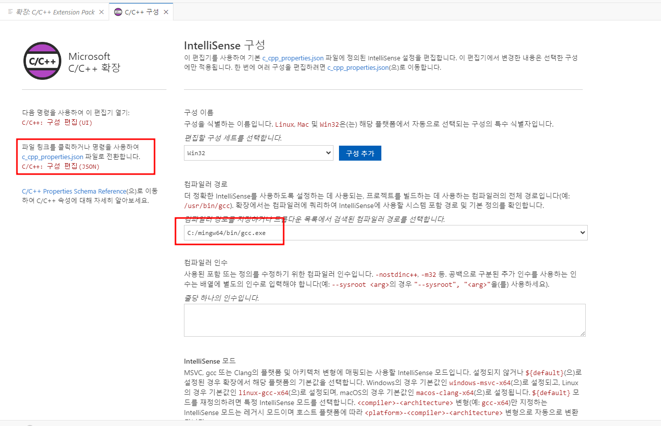 - UI 화면에서 설정을 변경 할수 있도 있고 c_cpp_properties.json 버튼을 클릭 하면 파일 에서 직접 수정 할수도 있습니다.