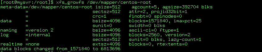 [root@mysvr:/root]$ resize2fs /dev/mapper/centos-root