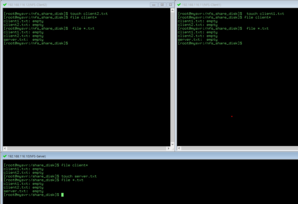 - 각 nfs 설치된 서버에서 파일을 생성하면 어떤 노드에서도 생성하더라도 파일을 공유할수 있게된다.