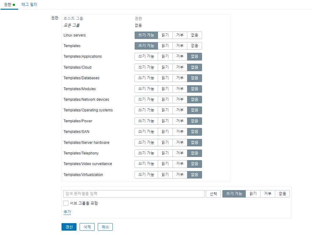 - zabbix 는 유저그룹 및 유저를 생성하여 권한을 부여할수 있습니다.