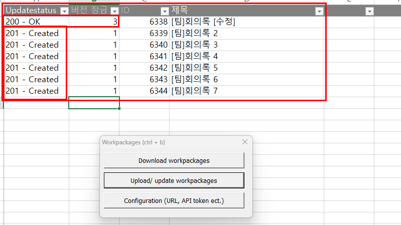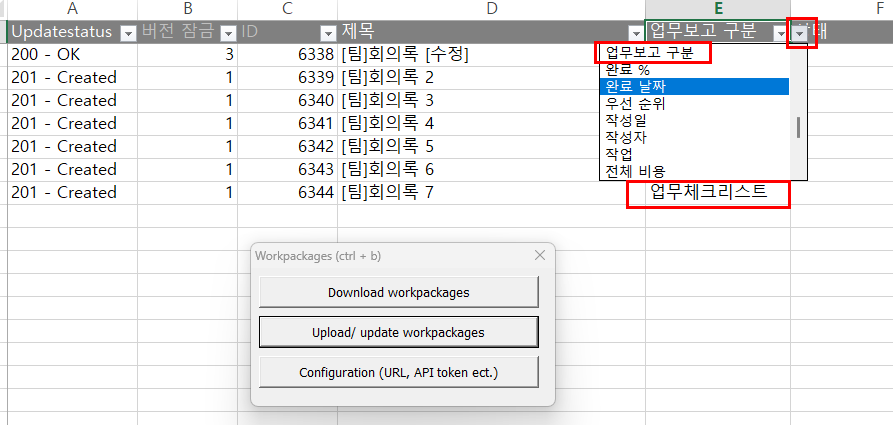 - 다운로드 workpackages 를 누르면 작업패키지 항목이 다운로드 된다.