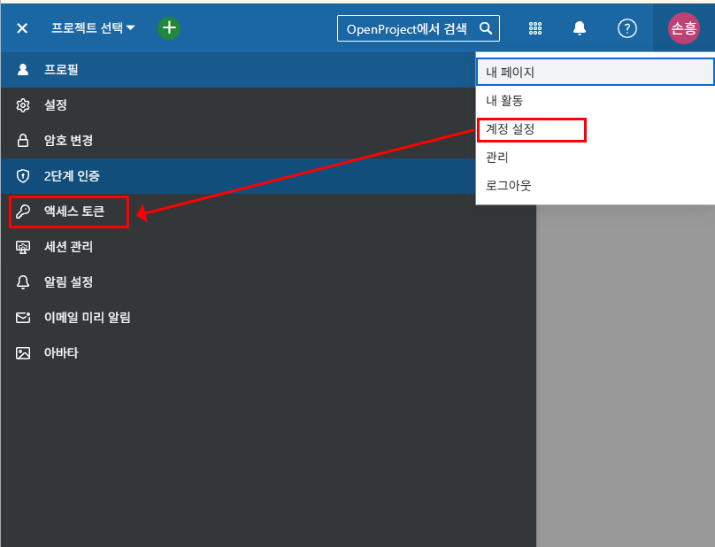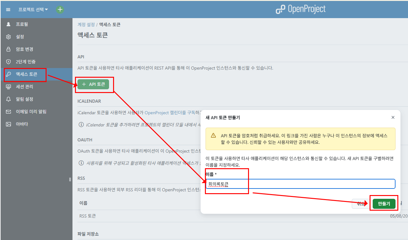 - API 토큰 정보는 우측 상단 계정설정 -> 액세스 토큰 메뉴를 선택후 접속 토큰을 생성 한다.