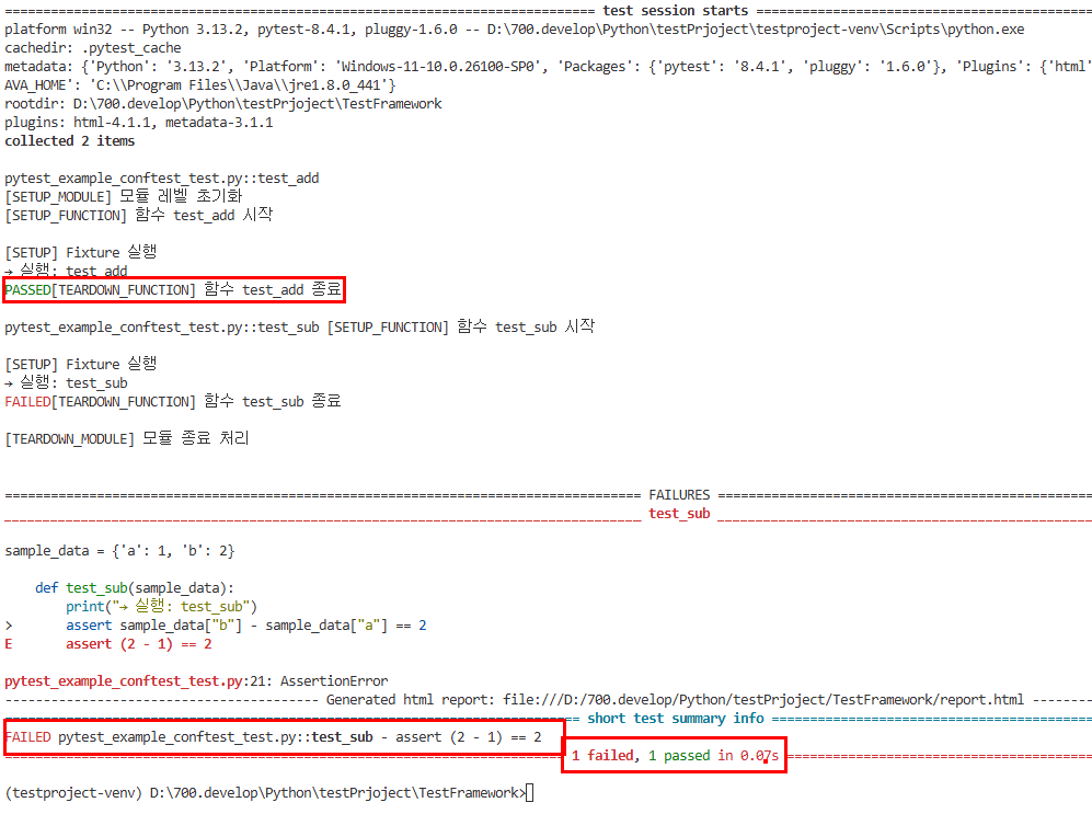 - conftest.py 에 정의된 샘플데이터를 불러와서 pytest_example_conftest_test.py 에서 테스트슬 수행 하게 된다.