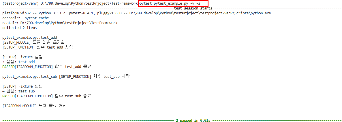 이러한 픽스처 메커니즘은 테스트 간의 의존성을 줄이고, 재사용 가능한 설정/해제 코드를 작성하는 데 매우 효과적입니다.