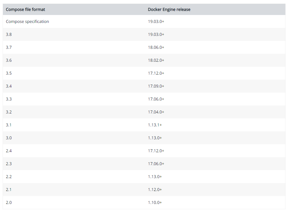 아래표는 도커 컴포즈 와 호환되는 도커 버전에대한 호환성 메트릭스 표입니다.