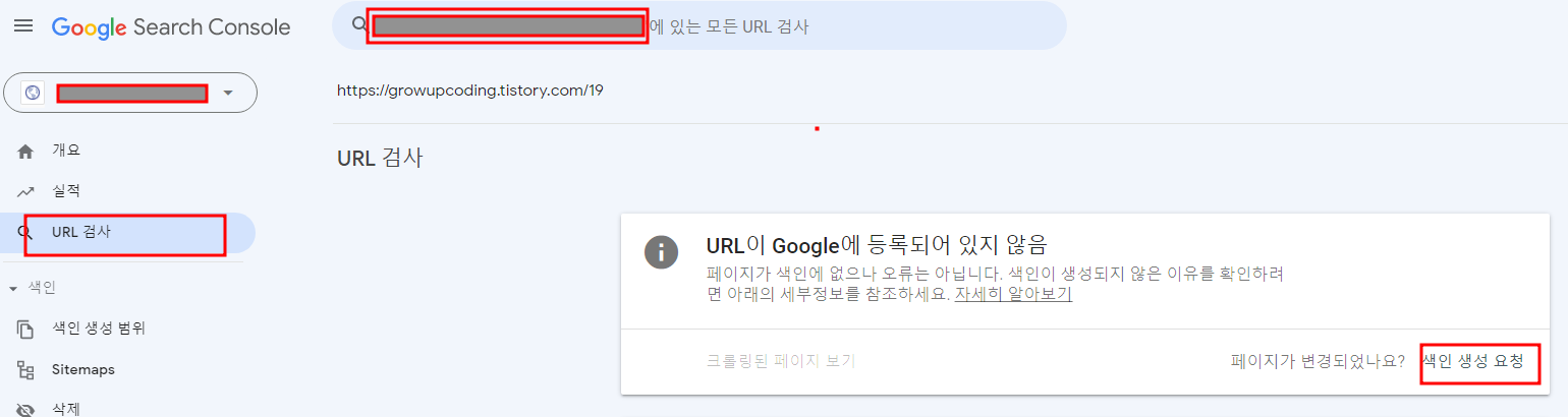 URL 검사 버튼을 눌러서 노출시킬 사이트에 대한 색인을 만드세요