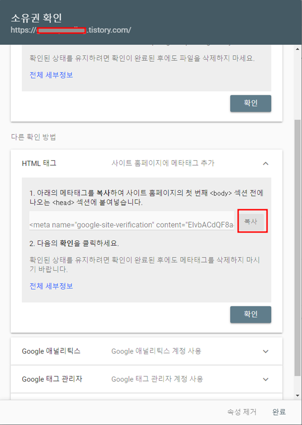하단 다른 확인 방법 중 HTML 태그 버튼을 눌러서 meta 태그를 복사합니다.