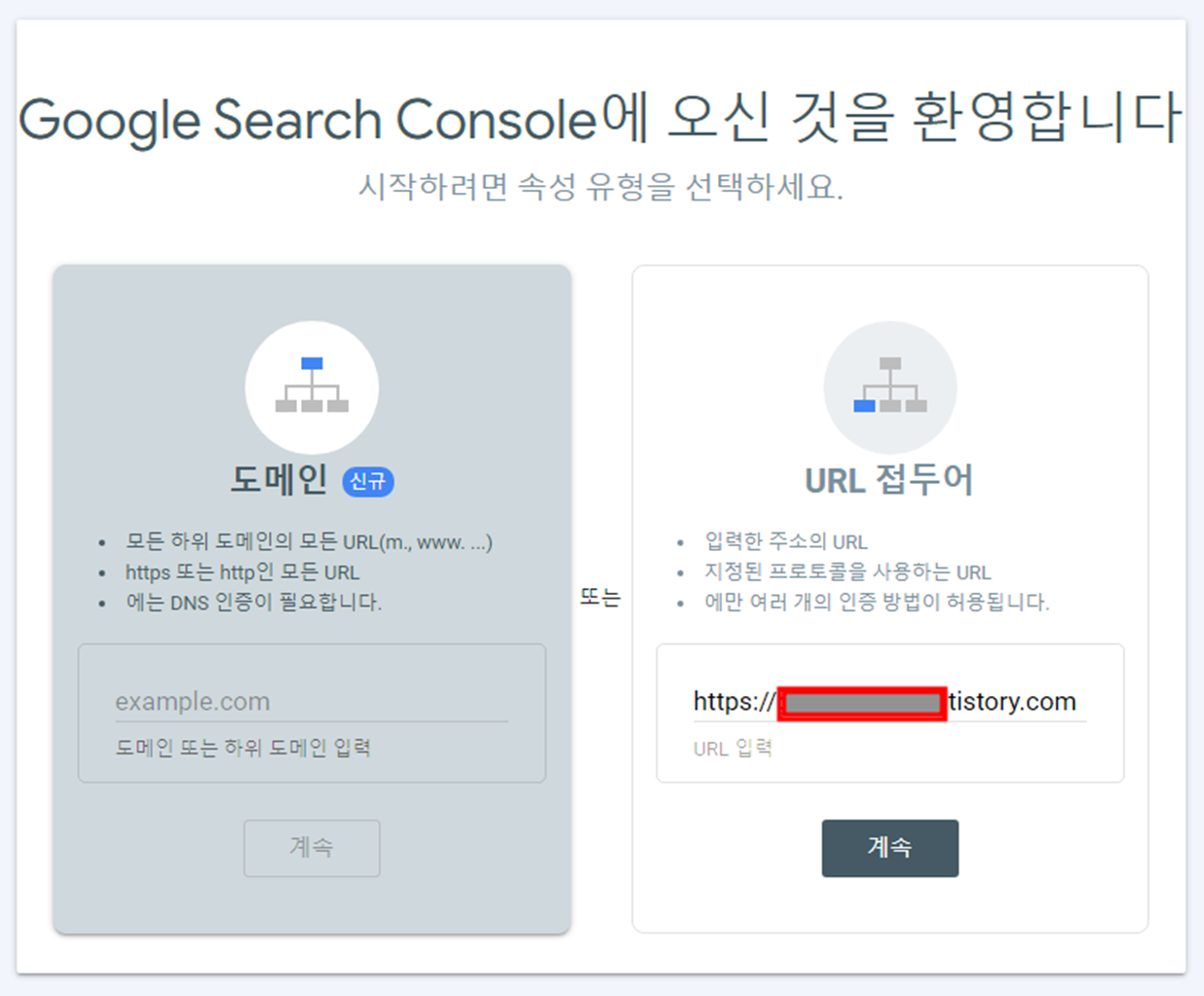 구글 서치 콘솔에 접속 하셨다면 노출 시킬 사이트 주소를 입력후 계속 버튼을 누릅니다.