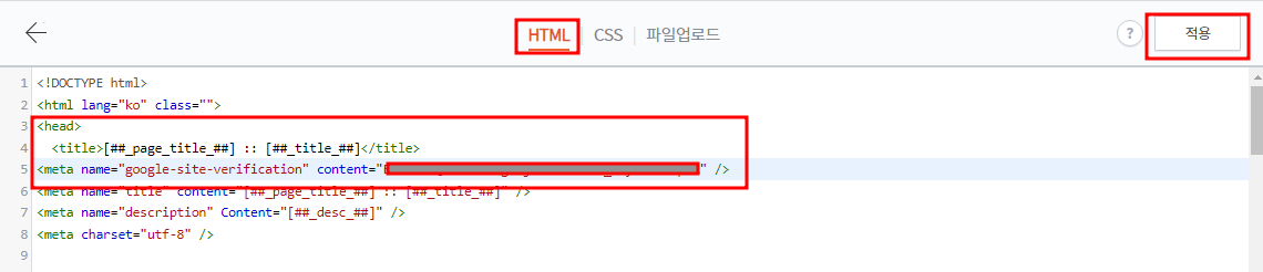 메타 태그 삽입이 완료 되었다면 적용 버튼을 눌러주세요!