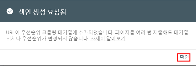 색인 생성 요청 버튼을 누르면 아래와 같이 색인 생성 작업이 진행 창이 나옵니다.