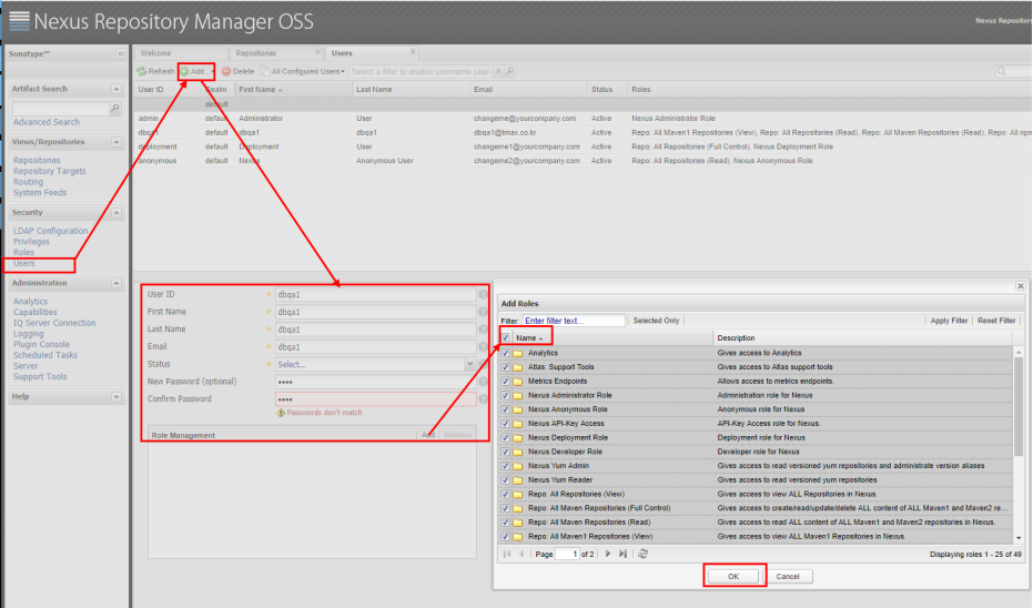 - Security -> Users -> add 버튼 클릭후 유저 정보 입력