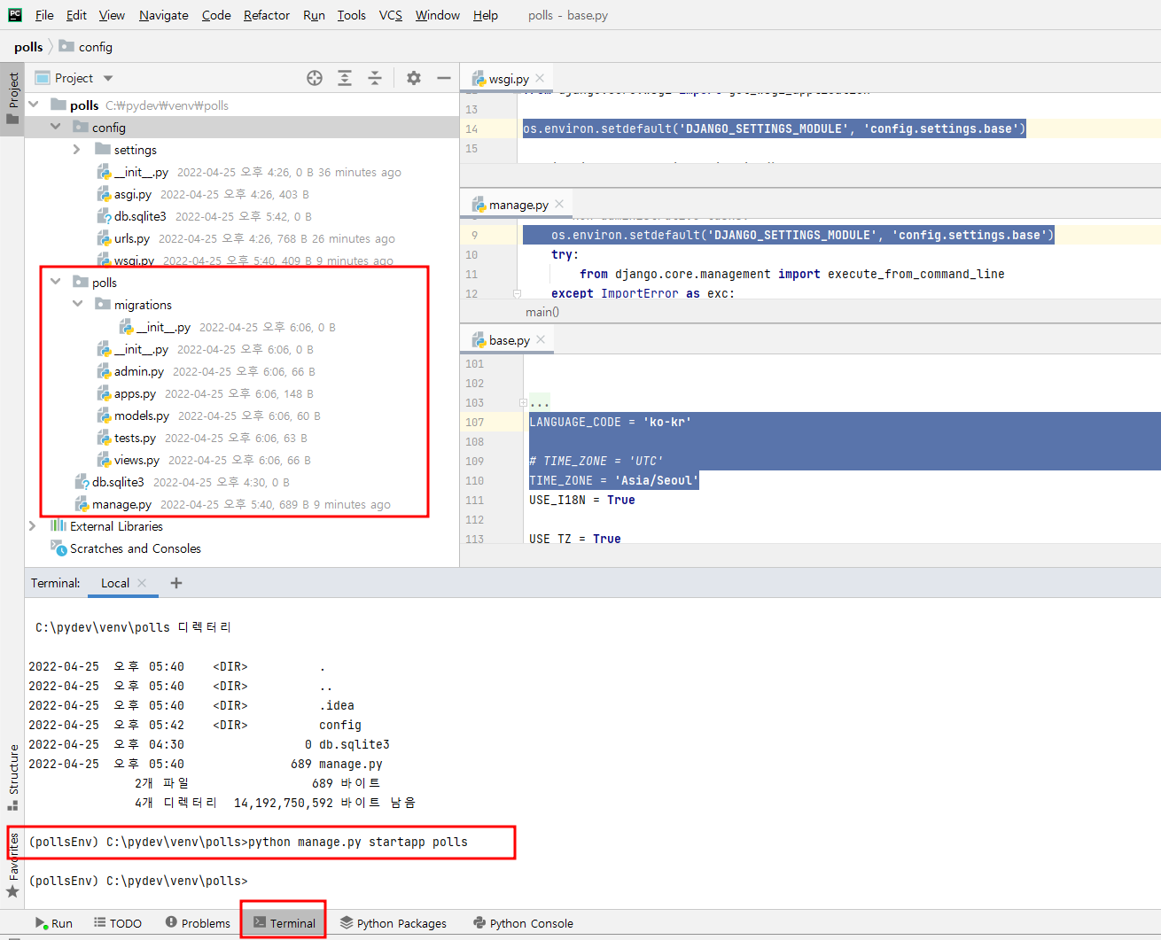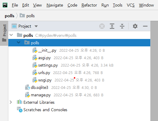 startproject 명령을 수행하면 manage.py , polls 디렉 토리가 생성됩니다.