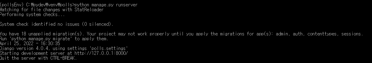polls 디렉토리에 있는 python manage.py runserver 명령을 수행하면 장고 웹이 실행됩니다.