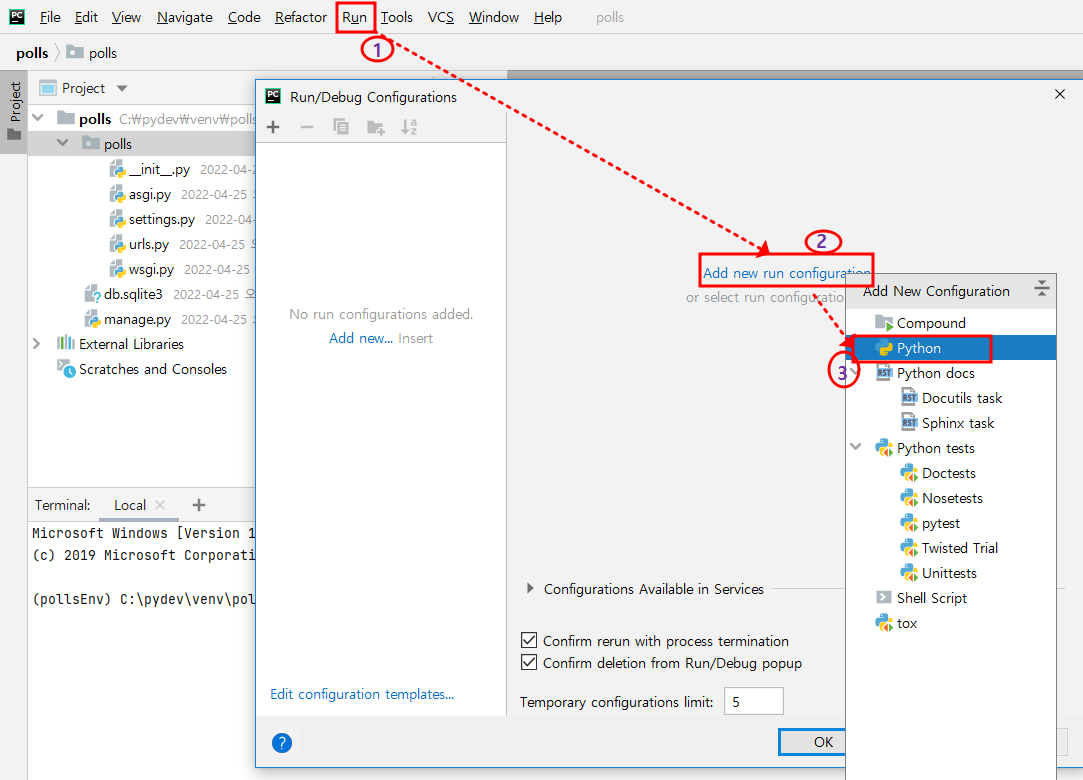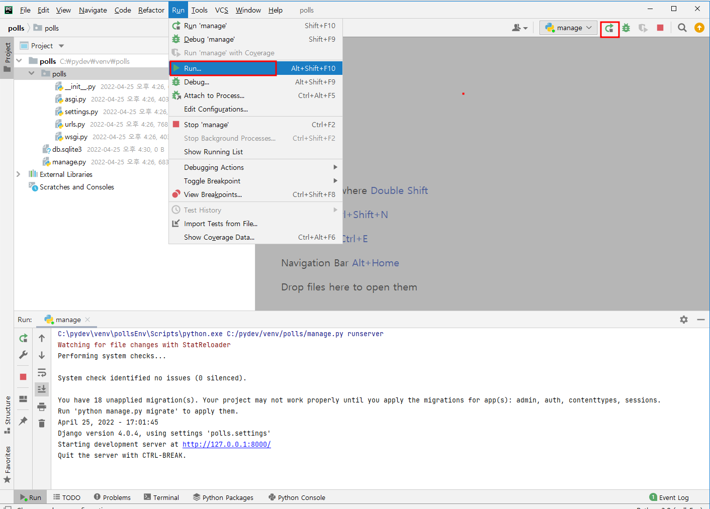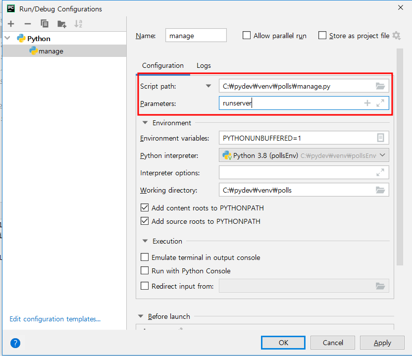 - Scripts : 장고 polls 프로젝트 manage.py 선택