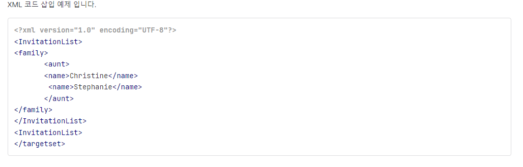 | XML 코드 삽입 예제 입니다. ```xml <?xml version="1.0" encoding="UTF-8"?> <InvitationList> <family> <aunt> <name>Christine</name> <name>Stephanie</name> </aunt> </family> </InvitationList> <InvitationList> </targetset> ``` |
