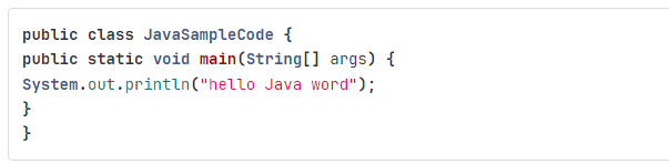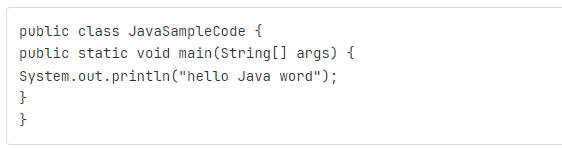 <pre><code> public class JavaSampleCode { public static void main(String[] args) { System.out.println("hello Java word"); } } </code> </pre> |