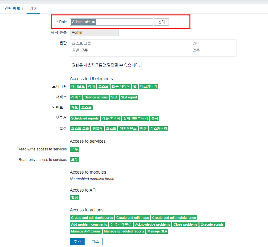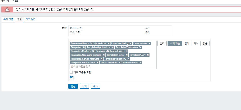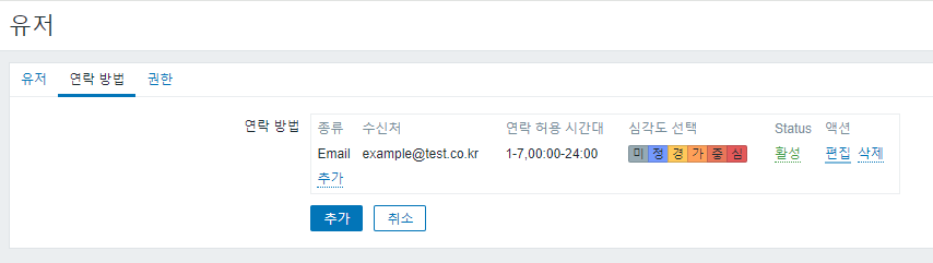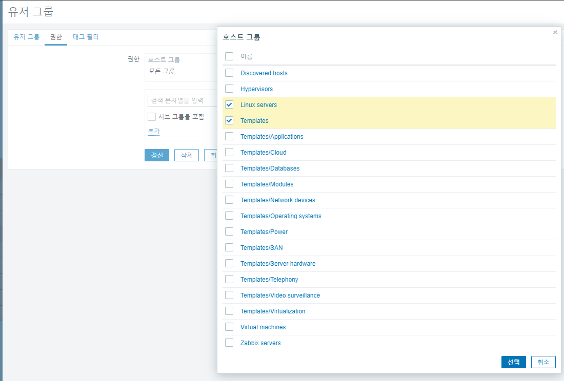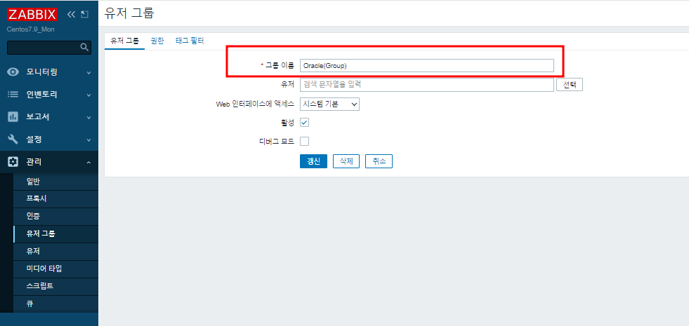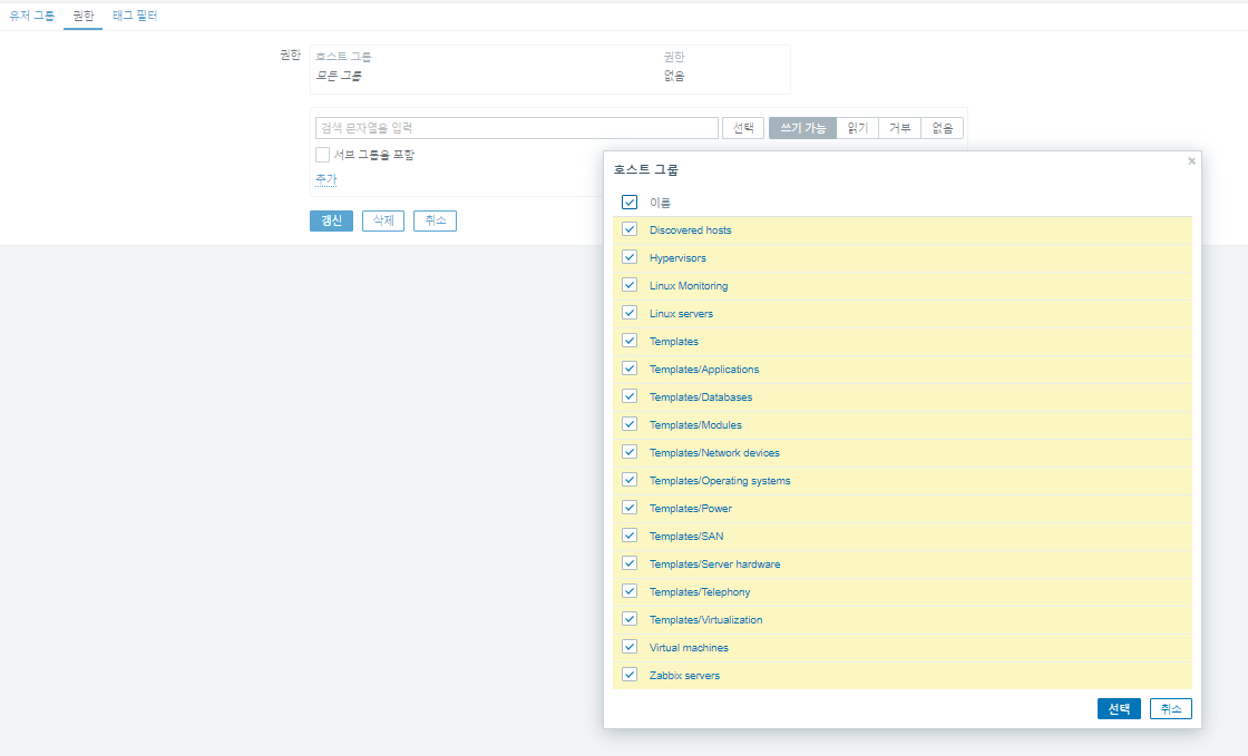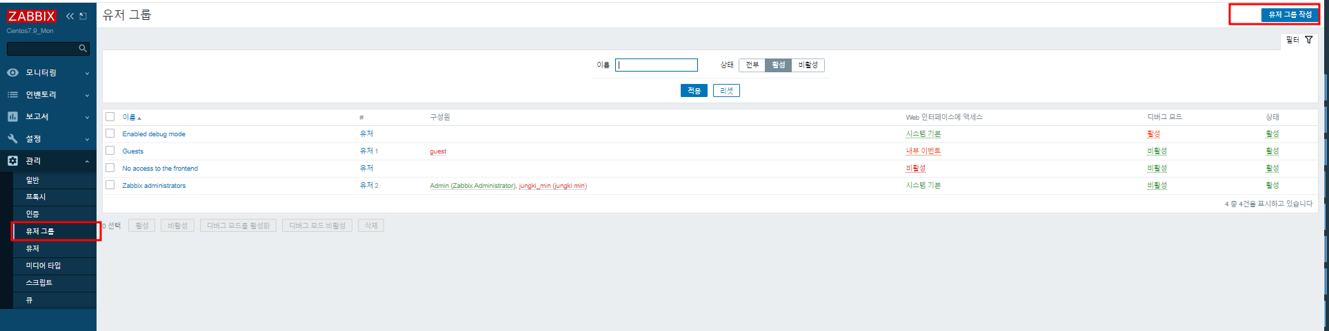 - zabbix 는 유저그룹 및 유저를 생성하여 권한을 부여할수 있습니다.