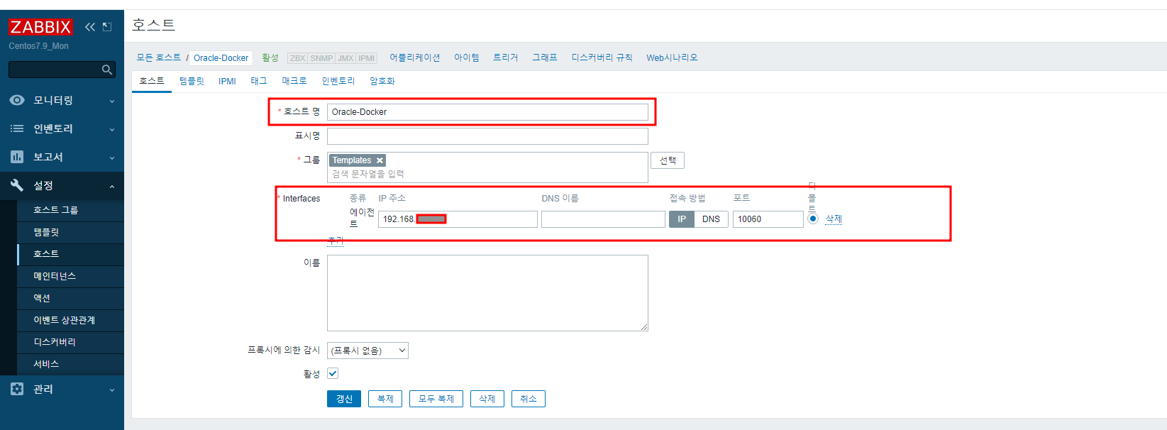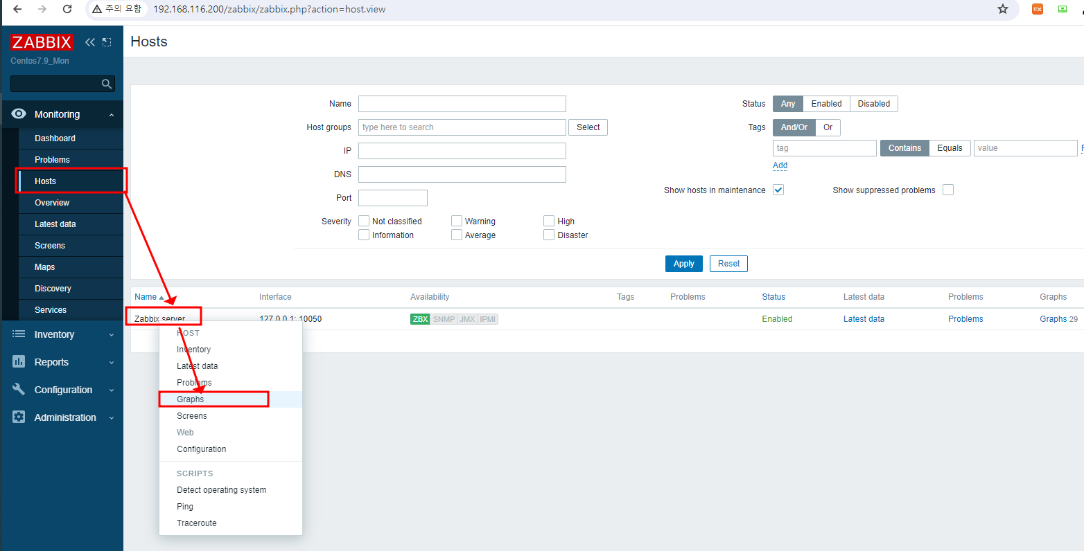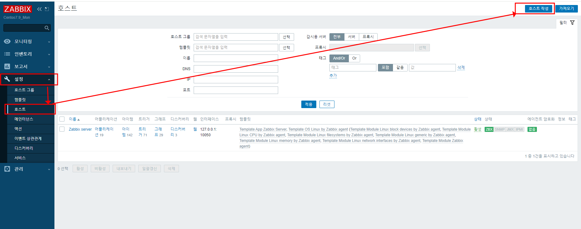 - 정상적으로 설치가 완료 되었다면 서버의 자원모니터링 하기 위해 호스트를 등록 합니다.