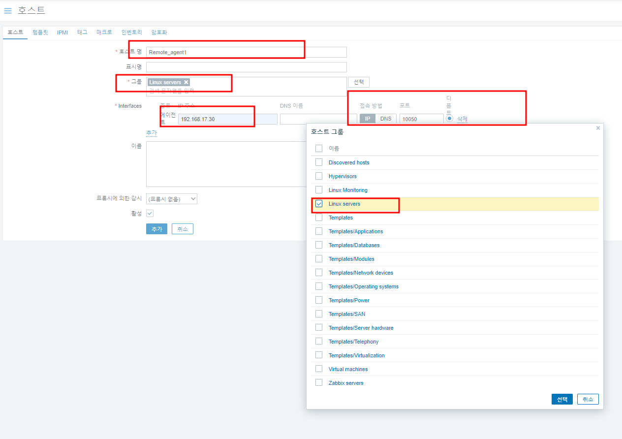 - zabbix 웹 브라우져에 접속 하여 모니터링 할 agent[호스트]를 등록 합니다.