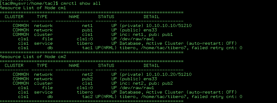 [tac@mysvr:/home/tac]$ cmrctl add service --name tibero --cname cls1 --type db --mode AC Resource add success! (service, tibero) [tac@mysvr:/home/tac]$ cmrctl add db --name tac1 --svcname tibero --dbhome $CM_HOME Resource add success! (db, tac1) [tac@mysvr:/home/tac]$ cmrctl show Resource List of Node cm1 ===================================================================== CLUSTER TYPE NAME STATUS DETAIL ----------- -------- -------------- -------- ------------------------ COMMON network net1 UP (private) 10.10.10.10/51210 COMMON network pub1 UP (public) ens33 COMMON cluster cls1 UP inc: net1, pub: pub1 cls1 file cls1:0 UP /dev/raw/raw1 cls1 service tibero DOWN Database, Active Cluster (auto-restart: OFF) cls1 db tac1 DOWN tibero, /home/tac/tibero7, failed retry cnt: 0 =====================================================================